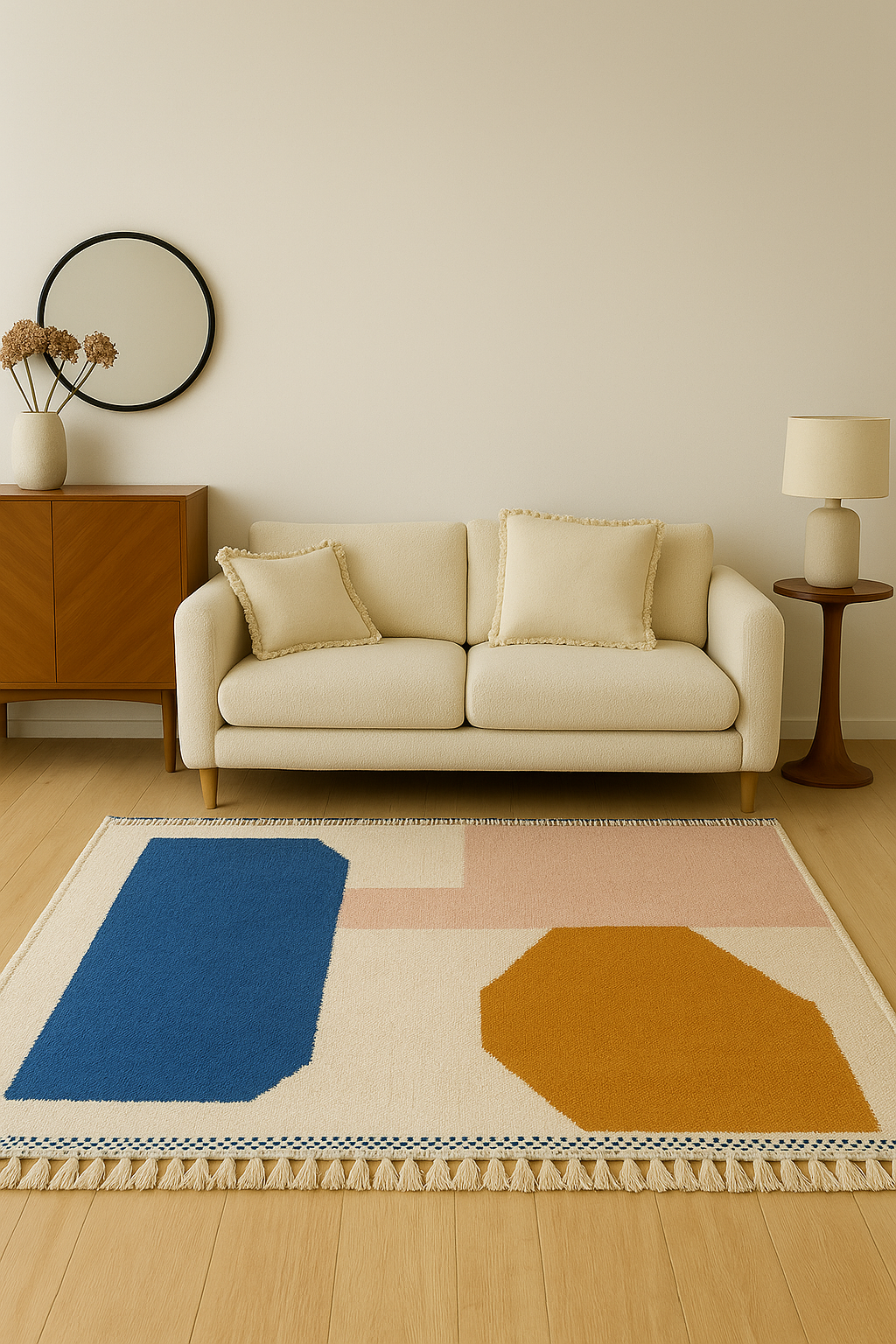 Blue Ember is a bold, gallery-worthy take on Moroccan textile art — a one-of-a-kind, heirloom-quality Boujaad rug handwoven in Morocco’s Middle Atlas from 100% natural wool. Striking geometric blocks in deep ember orange and rich indigo are softened by cream and pale blush accents, all coloured with natural, hand-mixed dyes for nuanced, organic contrast.