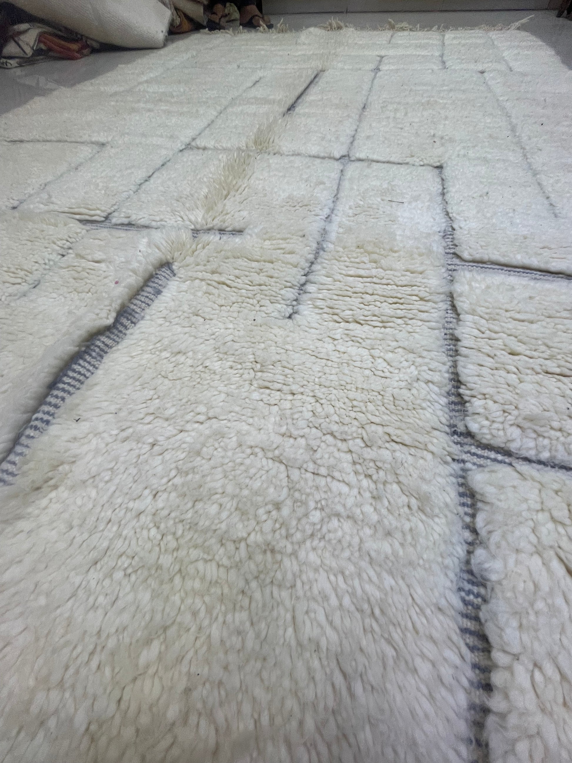 Whisper is a serene statement of understated luxury — a one-of-a-kind, heirloom-quality Beni Ourain rug handwoven in Morocco’s Atlas Mountains from 100% natural, undyed high-lanolin wool. Measuring 2.75m × 1.65m, it features a soft ivory base delicately traced with a precise grid of fine grey lines, evoking architectural sketches or ancient pathways.